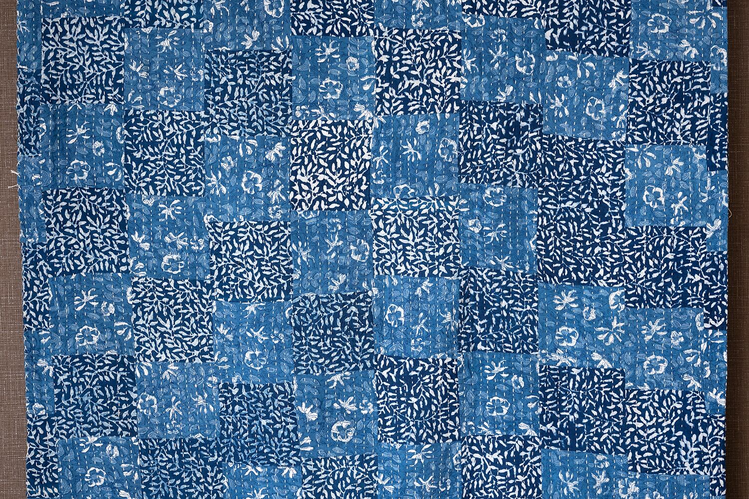 ラジャスタン州・バグルーの工房でつくられたハンドダイ・ハンドワークキルトです。ブロックプリントで染められた2種類の草花文様でパッチワークされた布と、藍の格子文様のリバーシブルになっており、カンタような刺し子のステッチが施され、凝ったつくりで大変しっかりしています。
