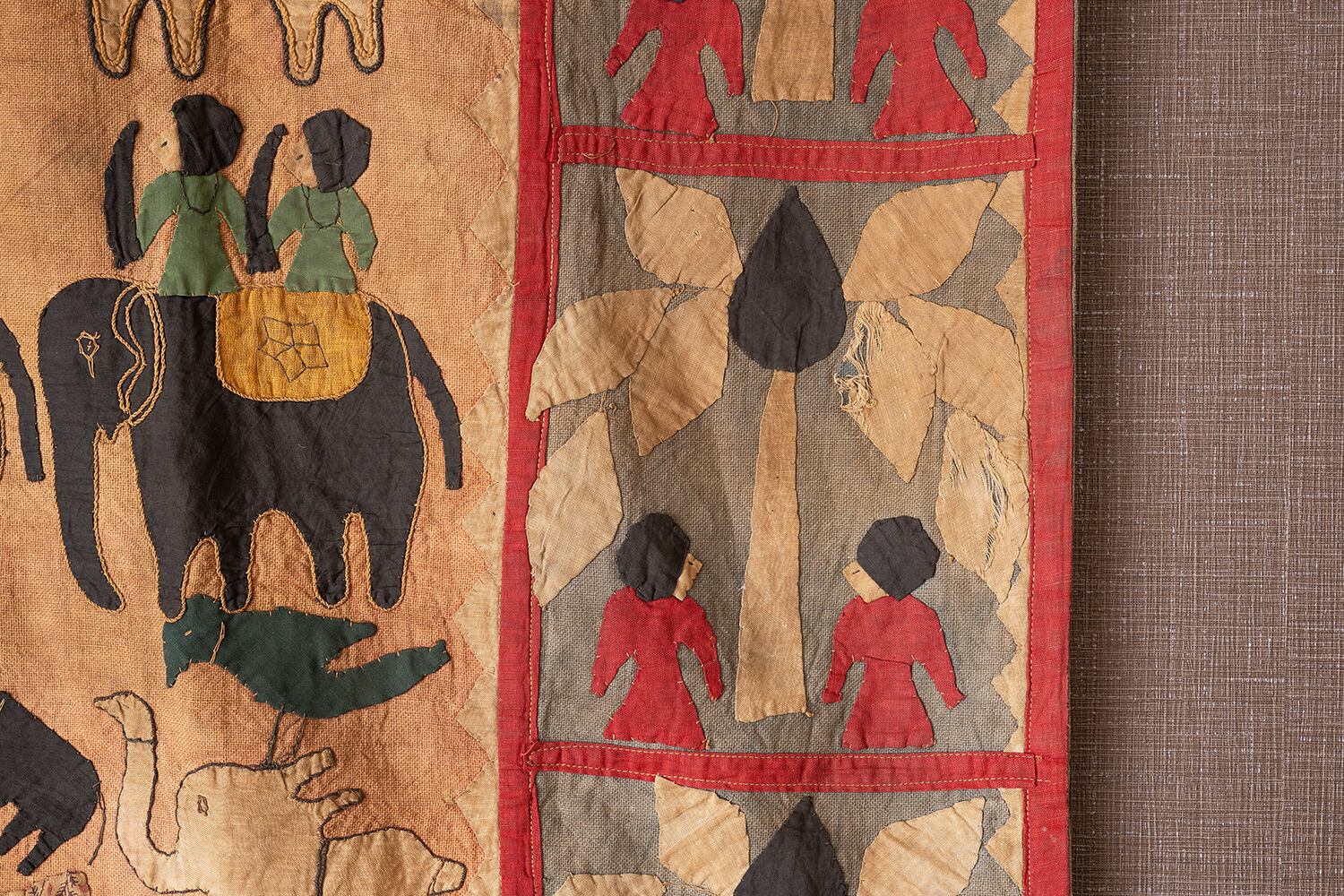 The patchwork motifs are freely painted with animals and people, unique and never boring to look at.It is in good condition and can be displayed and enjoyed like a painting.