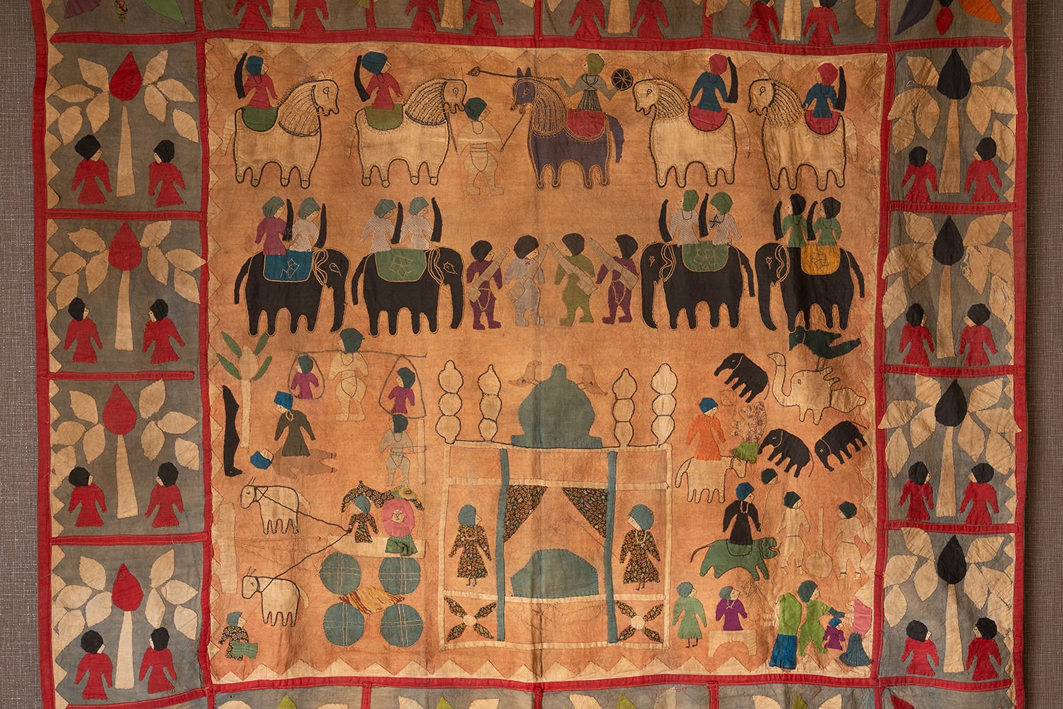 パッチワークのモチーフが動物や人が自由に描かれ、ユニークで見飽きる事がありません。